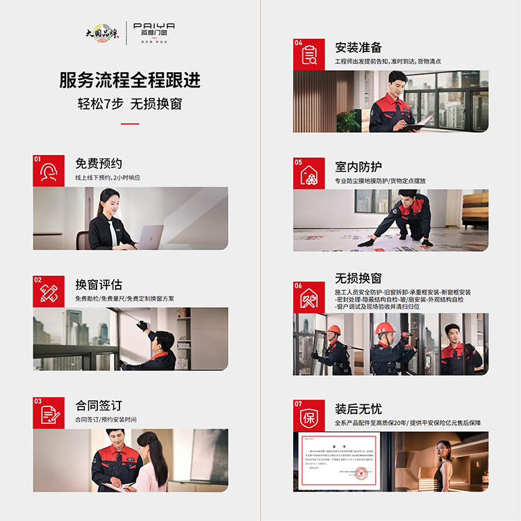 除了技术与产品的深耕,派雅门窗更以高品质服务践行品牌担当,重塑行业服务价值坐标。针对老房换窗 “破坏装修、耗时耗力、效果难控” 的三大核心痛点,2024年,派雅率先响应“国补+企补”政策,推出90分钟无损换窗解决方案,并成为国家以旧换新定点单位,精准衔接政策红利与消费需求,既降低消费者换新成本,又保障换窗效率与品质体验。