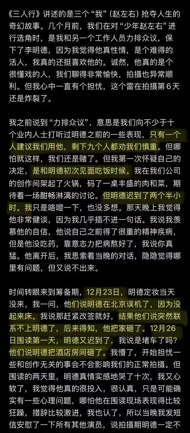 《三人行》剧组发表声明,将所有过错归咎于李明德,指责他未出席剧本围读、失联导致拍摄延误、暴力损毁酒店财物等行为。