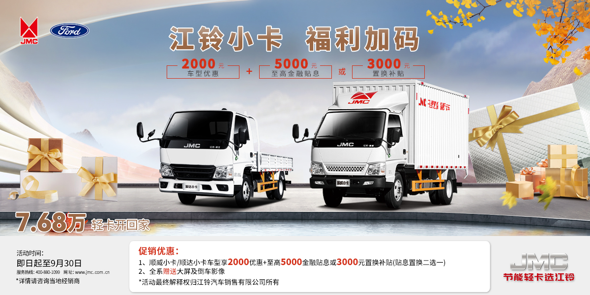 金秋的九月,大地披上了丰收的华服,也迎来了物流运输行业蓬勃发展、竞相提升实力的关键时期。在这一充满机遇的节点上,江铃汽车精准捕捉市场脉搏,适时启动了盛大的九月促销活动,为众多消费者送上了温暖人心的礼遇。