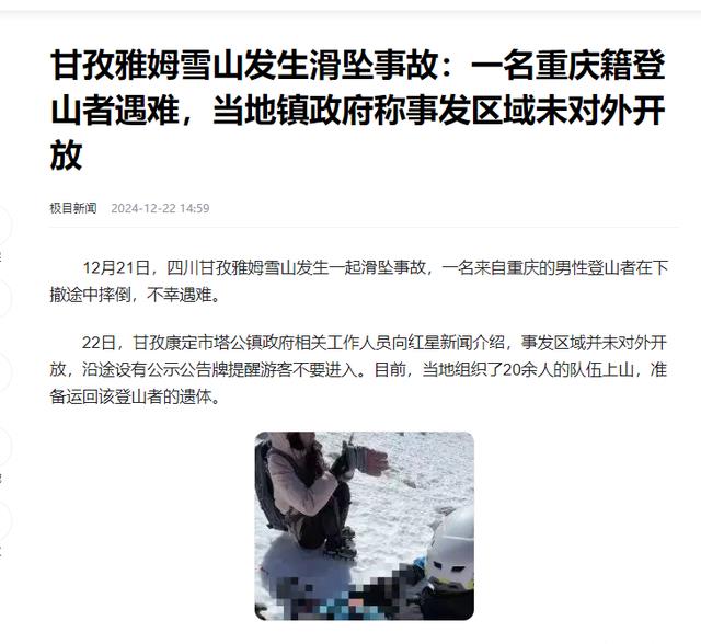 去年一位来自重庆的登山者在四川甘孜雅姆雪山下撤途中摔倒,不幸遇难。