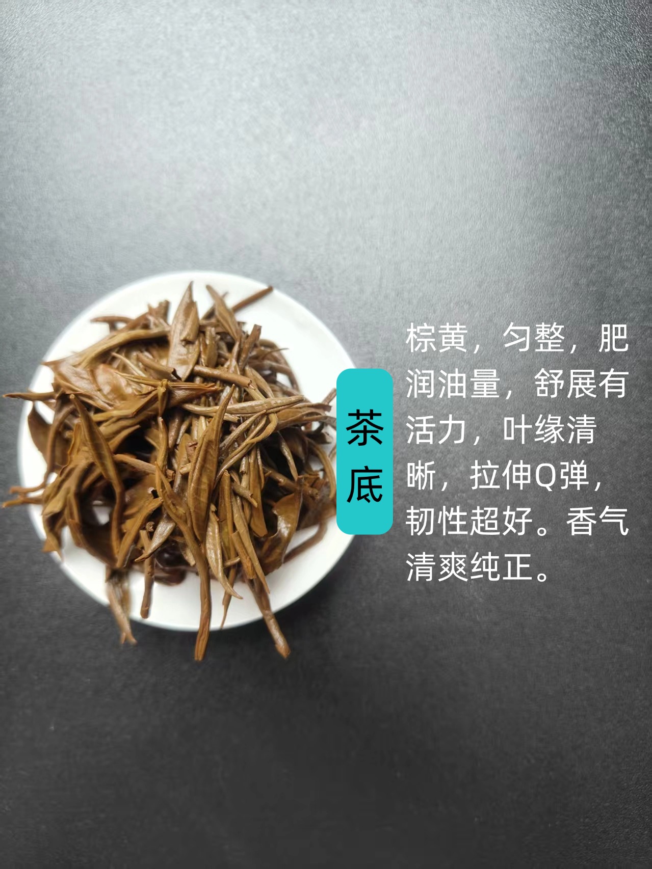 叶底,棕黄,匀整,肥润油量,舒展有活力,叶缘清晰,拉伸Q弹,韧性超好。香气清爽纯正。