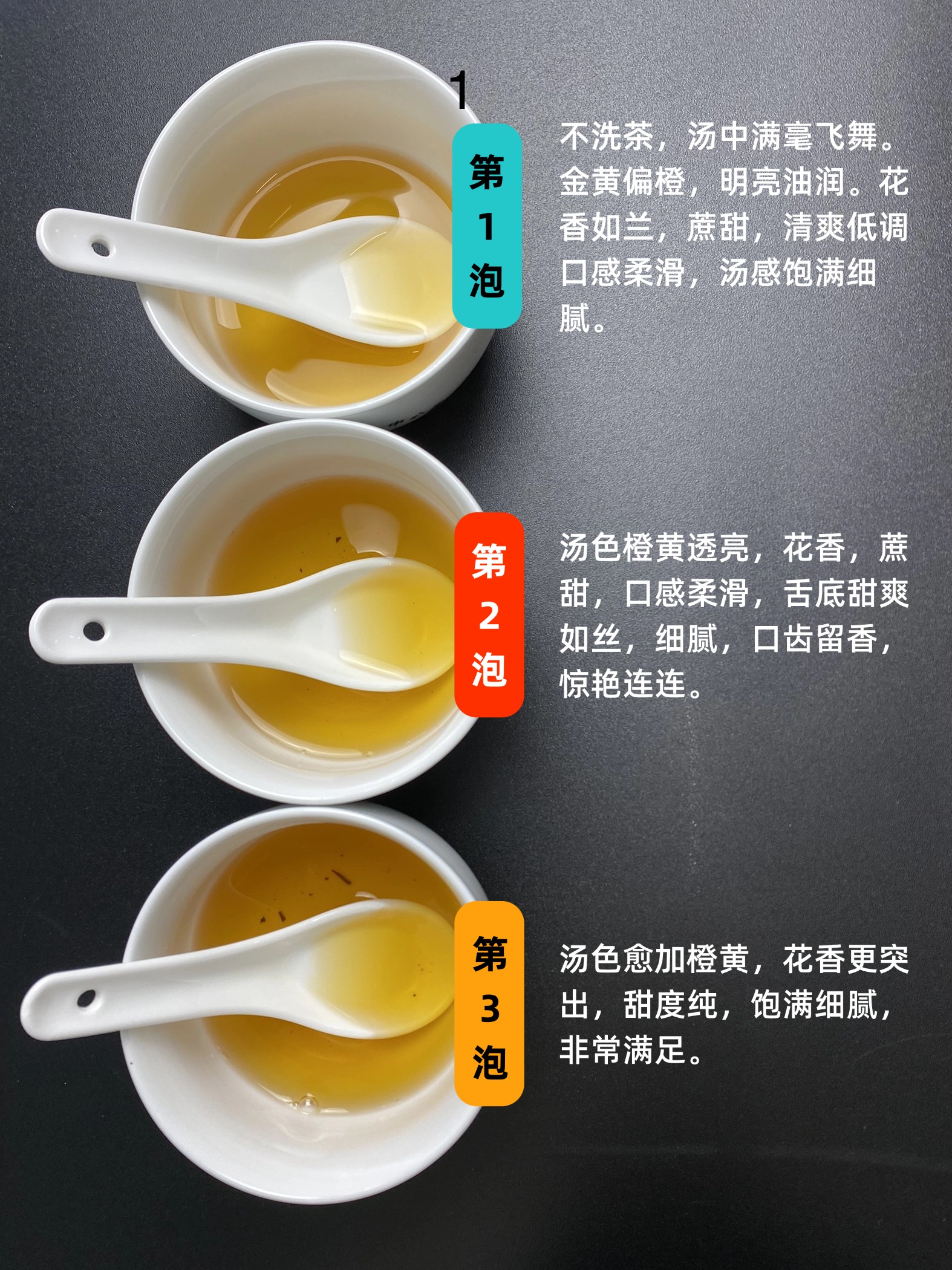 第二泡汤色橙黄透亮,花香,蔗甜,口感柔滑,舌底甜爽如丝,细腻,口齿留香,惊艳连连。
