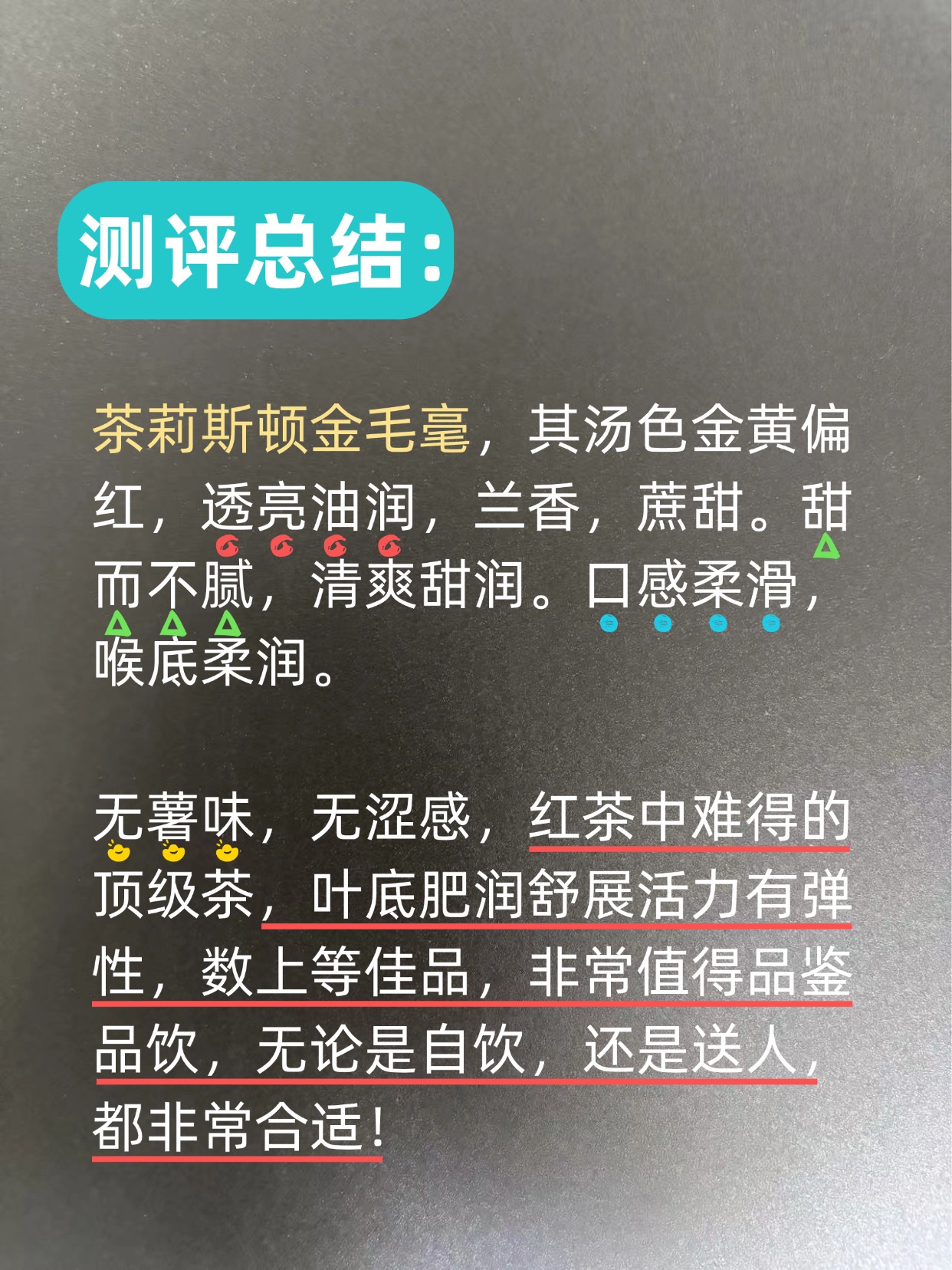 茶莉斯顿这款金毛毫,其汤色金黄偏红,透亮油润,兰香,蔗甜。甜而不腻,清爽甜润。口感柔滑,喉底柔润。无薯味,无涩感,红茶中难得的顶级茶,叶底肥润舒展活力有弹性,数上等佳品,非常值得品鉴!