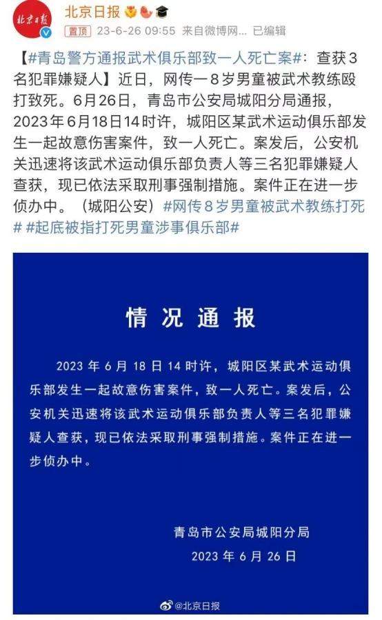 青岛市公安局城阳分局发布通报,强调了案发时间为6月18日14时,涉案的武术俱乐部负责人共三名,已经依法采取刑事拘留。