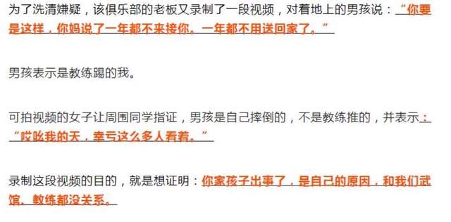 而作为武术俱乐部的三名成年人,在孩子出现不良症状时,还在一旁嘲讽他,是不是装模作样,还询问其他学生:“是他自己倒的,还是教练推的。”
