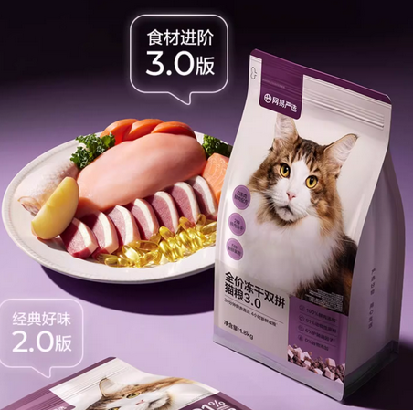 网易严选作为互联网跨界品牌,其猫粮凭借透明化供应链、高性价比在国产市场中有一定的受众,适配大众养宠人群,后期还推出了网易天成系列来覆盖中高端产品,什么猫粮好吃了健康?满足不同预算和养宠需求。这款猫粮主打鲜肉配方,用了鲜鸡肉、鲜鸭肉,总占比超过70%,提供44%以上的蛋白质和19%以上的脂肪。作为膨化猫粮,颗粒内层为鲜肉注浆膨化工艺,中层还喷涂了肉浆成分,表层包裹了冻干鸡肉碎,层层包裹口味层次更丰富,另外,猫粮还添加了冻干鸡肉粒和冻干鸭肉粒成分。