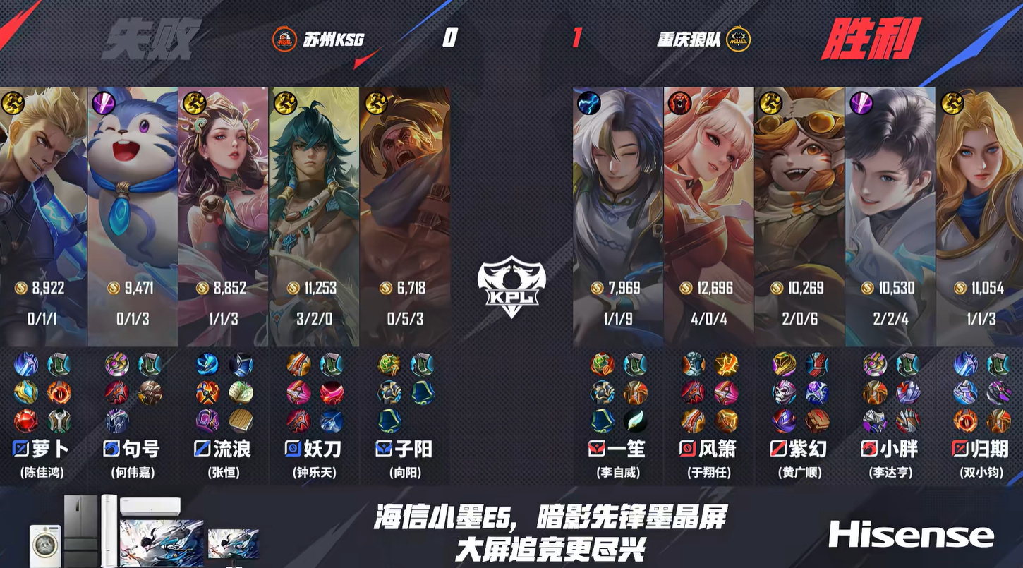 第一局前期风箫就操作了妖刀一波,妖刀的苍半血在塔下想吃尾刀,风箫直接越塔带走妖刀。狼队一直优势的情况下,KSG也不是完全没有机会,暴君团战狼队先打出了苏烈的被动,但子阳站起来之后秒大招击飞小胖和一笙,直接击杀两人,KSG也顺势拿下暴君。不过轮到KSG进攻的时候,妖刀的走位太靠前了,直接被小胖连坐两下,一笙空空儿进场打控制,直接秒掉妖刀和子阳。KSG只剩下三个人,狼队持续追击,最终流浪和萝卜也走不掉了,狼队打了一波零换四结束比赛。