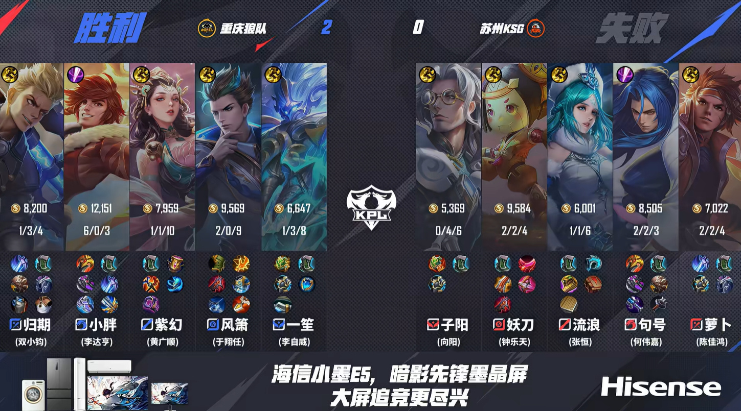 第三局KSG前期的分线有布置,曹操和孙尚香去对抗路,太乙一个人在下路。可能是想抓归期一个一血,但归期压根就没出去清线,导致太乙一个人单吃了两个发育路兵。KSG看着人头优势,但实际上经济并没有领先,转折点出现在入侵红区的时候,紫幻的嫦娥两次定到大司命,句号大招也坐空了,小胖拿到人头。萝卜进场想切风箫也被风箫闪现拉开,狼队打出一波零换二。等狼队拿到优势之后,就没有打太多团战,一直运营运营就领先了几千经济,击杀萝卜之后顺势一波拿下,3-0进入下半场。