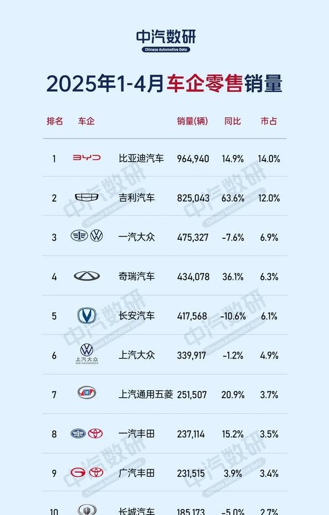综上所述,2025年的中国乘用车市场正处于风云变幻的激荡之中。从数据来看,长期以来自主品牌强劲回升,尤其是比亚迪和吉利,已经成为行业中的佼佼者。相比之下,各大合资品牌如一汽大众、上汽大众、丰田等,不可避免地受到市场调整的压力,未来是否能维持当前格局,将是各方关注的焦点。