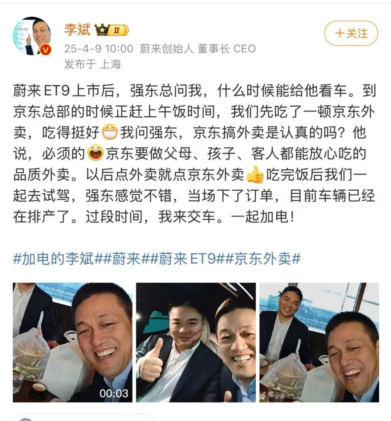 4月9日,蔚来李斌发微博称自己到京东总部吃外卖,刘强东还下单ET9。期间李斌问刘强东,京东搞外卖是认真的吗?得到的是肯定的答复:“必须的。京东要做父母、孩子、客人都能放心吃的品质外卖”。