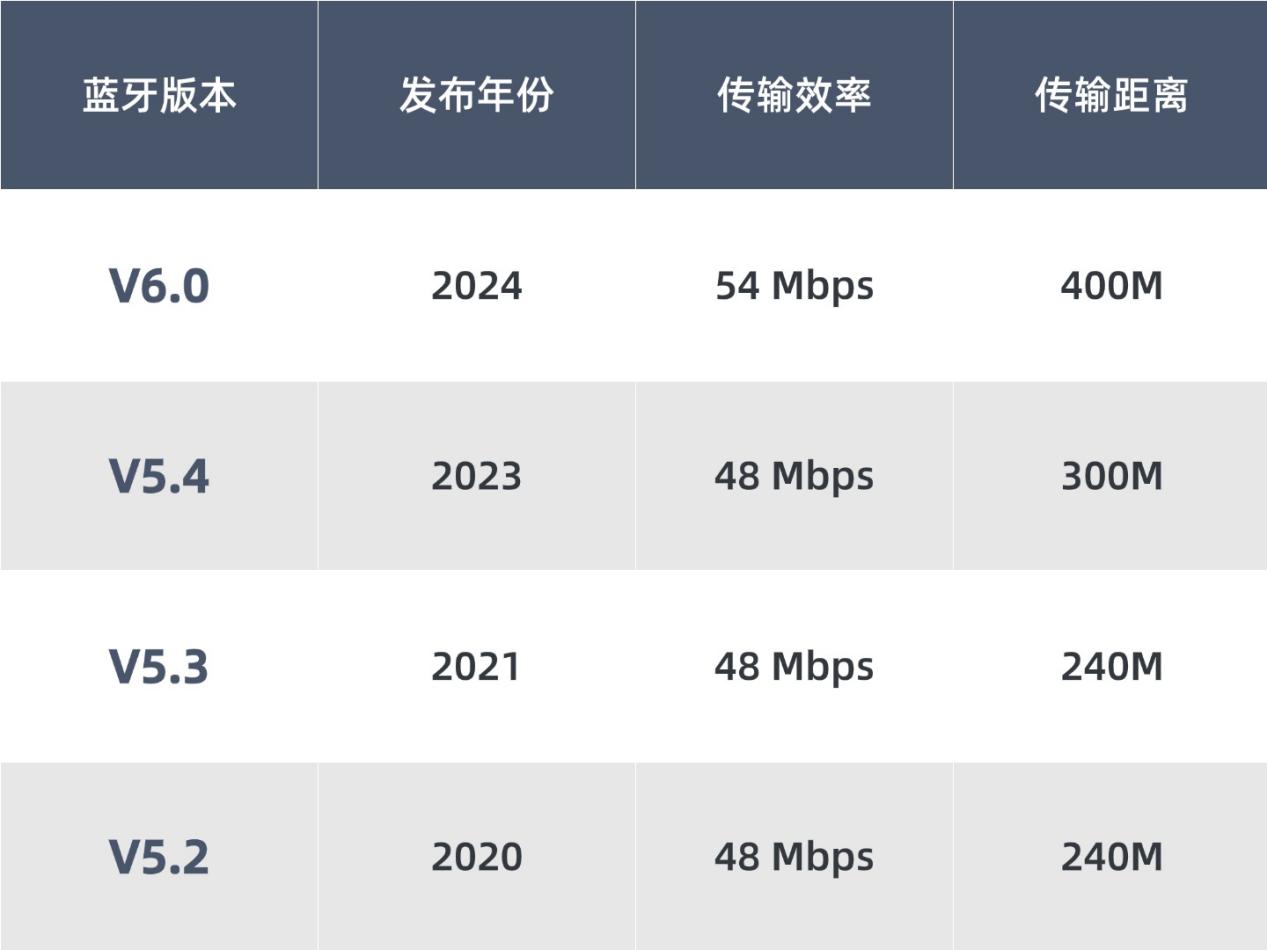 蓝牙版本直接决定了蓝牙耳机的传输性能和连接质量,蓝牙的版本越高,蓝牙的传输性能就越好,2024 发布的 蓝牙 6.0 是现在最高版本的蓝牙,其次就是 2023 年发布的 蓝牙 5.4,在挑选耳机的时候最好选择这两个版本的款式。