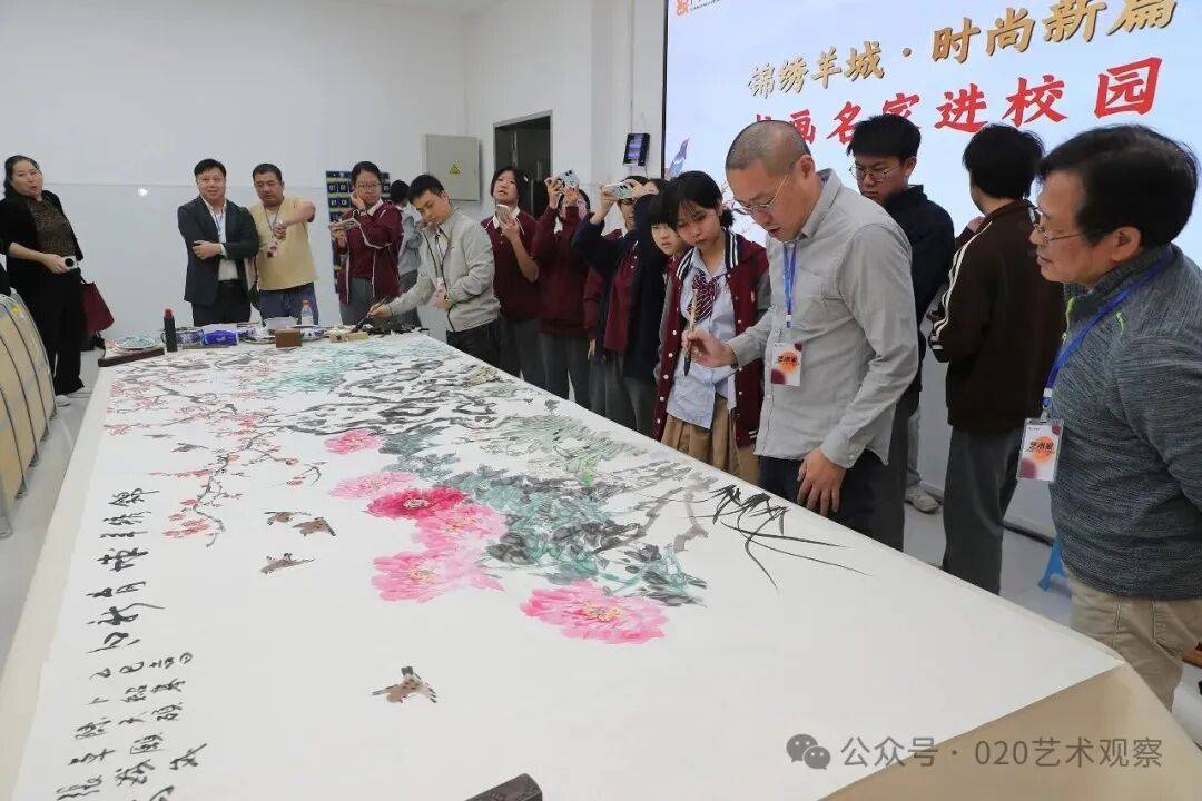 部分师生代表、嘉宾在巨幅《锦绣羊城育新知》作品前合影冬日的广州市纺织服装职业学校校园,翰墨飘香,艺韵盎然。2025年12