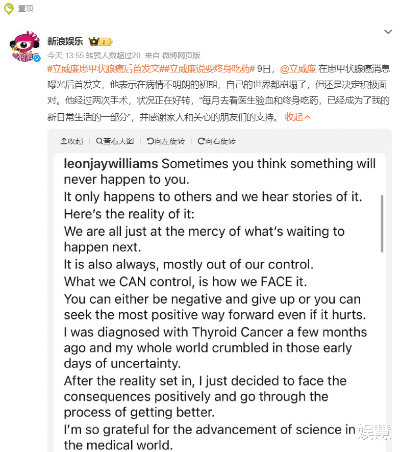 12月9日,立威廉患甲状腺癌的消息引发关注后,其本人也通过社交平台发了一篇长文,讲述自己的抗癌历程,同时也感谢了大家的关心。