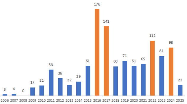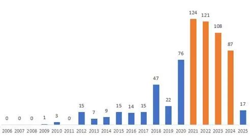 统计横店东磁各年的专利申请量,我们可以看出,其申请量在2020年总体在50件以下,从2020年开始,电池相关的专利量才逐渐提升,2021年,横店东磁申请量为124件专利,是其申请量最高的一年,至2023年又略有下降,但仍保持在108件以上。2025年,因为还有新申请的专利没有公开的原因,目前仅统计到有17件专利。