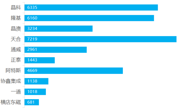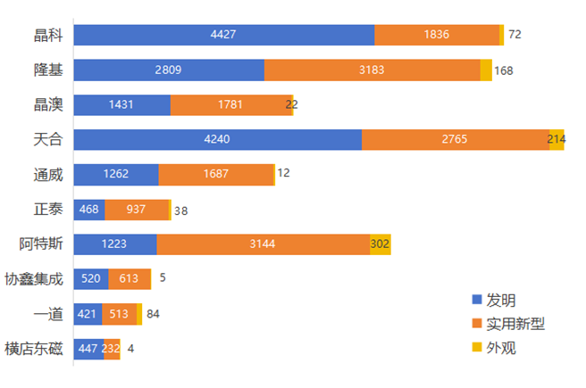 根据统计结果可以看出,天合光能的申请量在所有企业中排名第一,达到了7219件!晶科、隆基的专利量则排在第二三位。