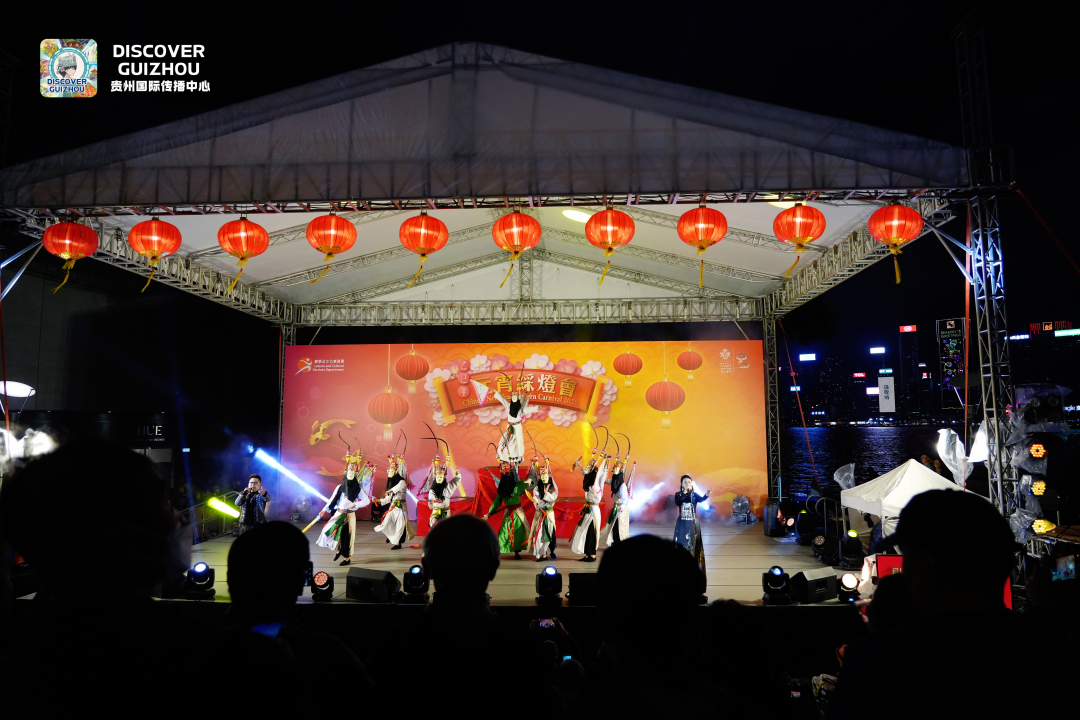 以美丽的维多利亚港夜色为背景,多彩贵州文艺展演舞动香港。(图/周璇)