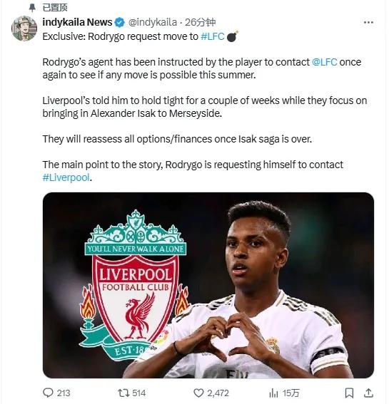 在罗德里戈拒绝加盟热刺的消息传出后不久,利物浦知名博主indykaila News发布独家消息,罗德里戈经纪人已经得到球员指示,再次联系利物浦寻求在今夏是否有可能进行转会。据了解,利物浦目前正专注于纽卡前锋伊萨克的转会交易。他们愿意为伊萨克送上一份1.5亿英镑的转会报价,并为伊萨克提供一份30万英镑周薪的合同。将这位英超银靴带到安菲尔德。利物浦方面希望罗德里戈保持耐心,一旦伊萨克的转会完结,利物浦将重新评估球队的财务状况和其他引援方案。值得一提的是,罗德里戈本人现在主动联系利物浦请求加盟。