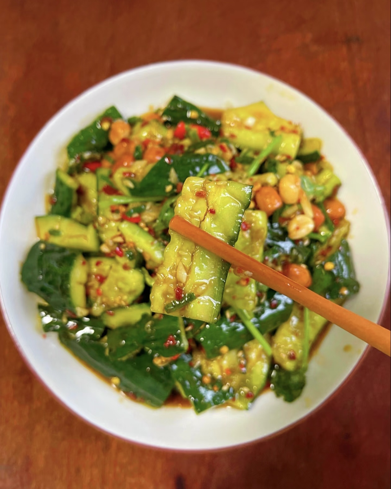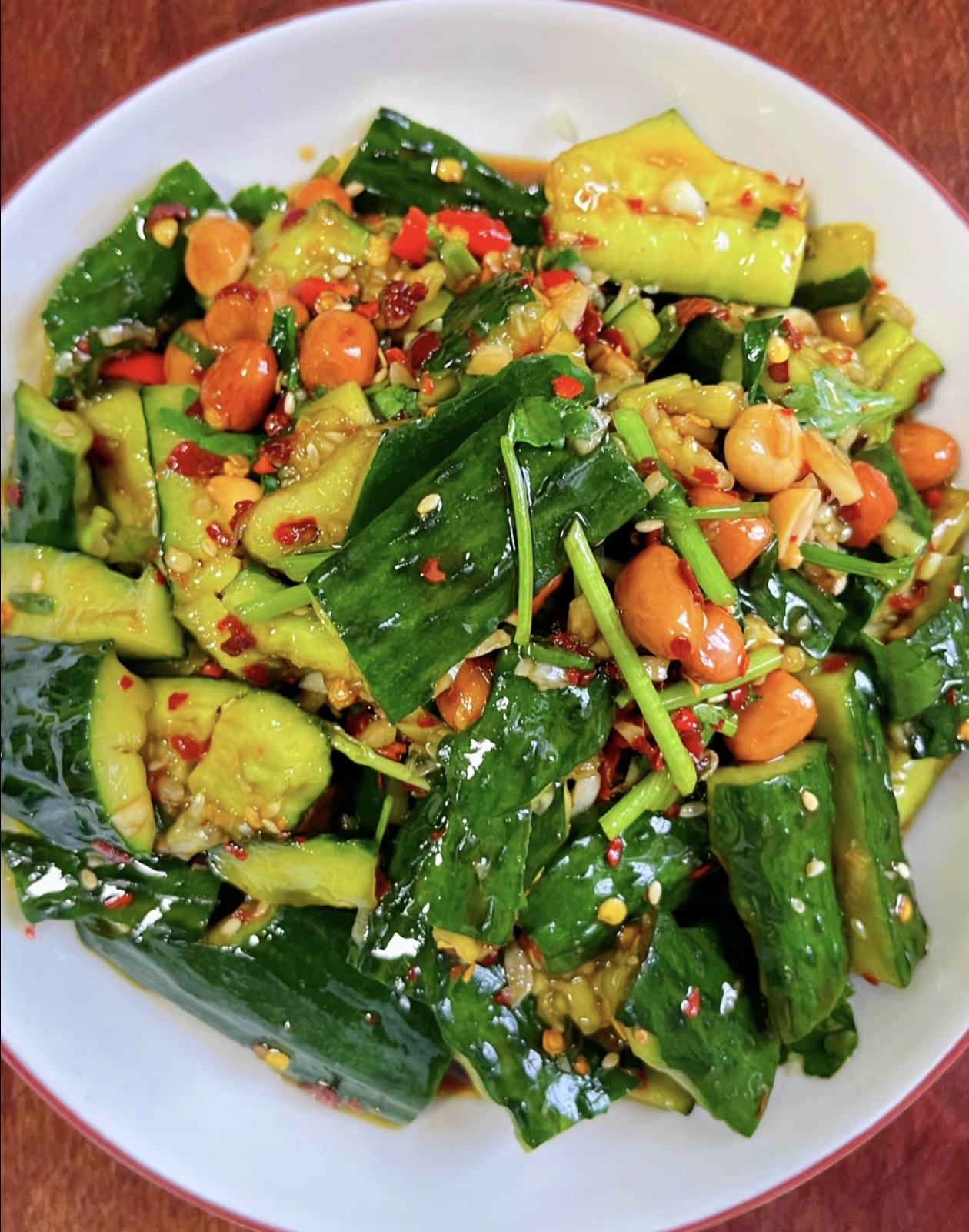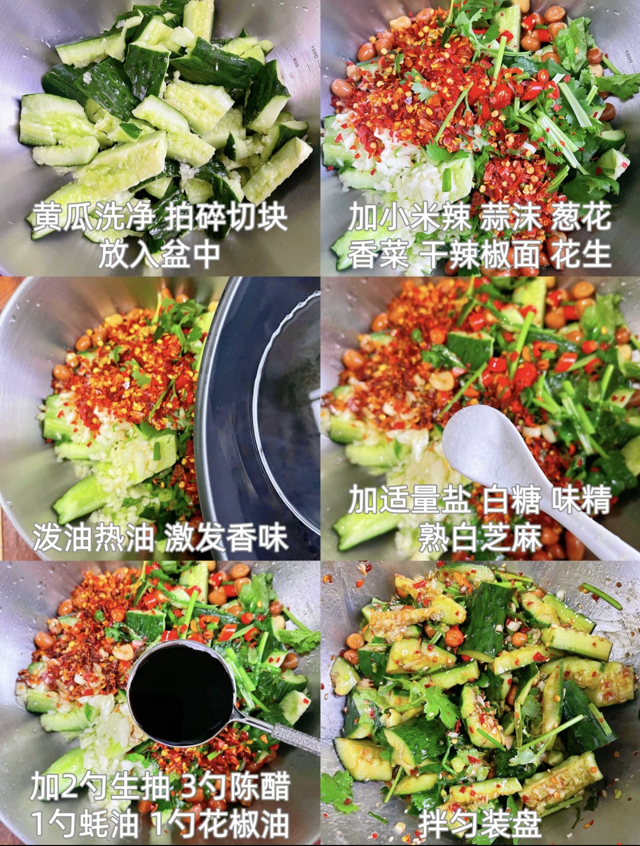 然后,我们来给黄瓜“加料”。把切好的小米辣圈、蒜末、葱花、香菜段和炸花生米一起倒进装黄瓜的盆里,再撒上一大勺干辣椒面。接下来,烧一勺滚烫的热油,“滋啦”一声浇在干辣椒面上,瞬间就能激发出浓郁的香味,整个厨房都香迷糊了。
