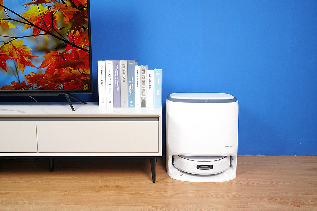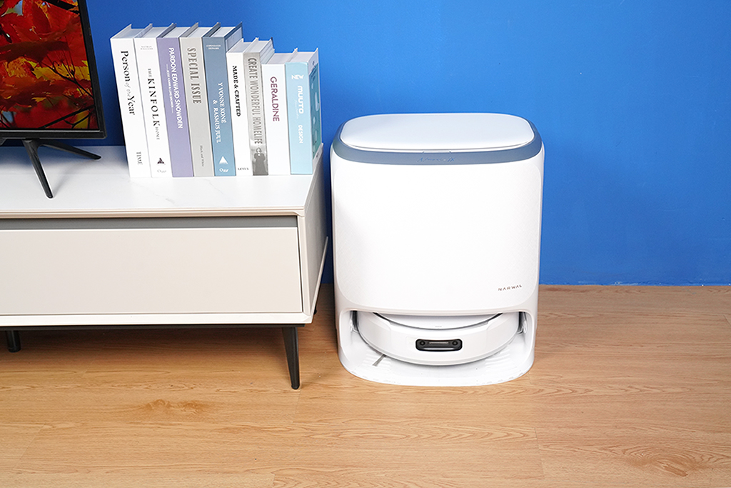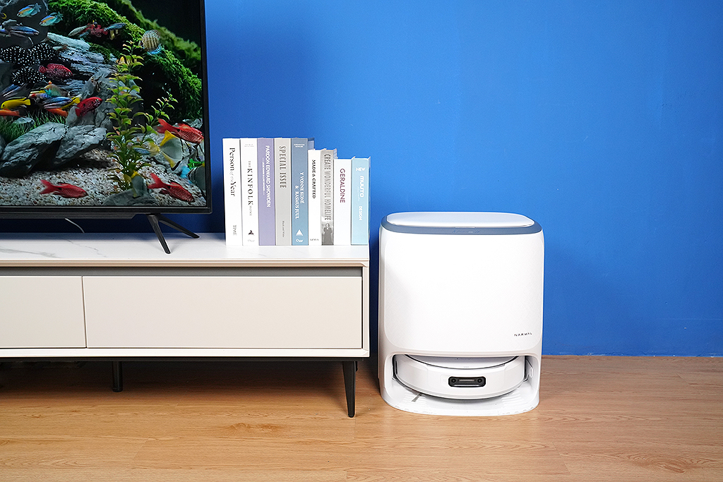 实测安装时,不用看说明书也能上手,我一个手劲不大的女生,拎着主机(手感不算沉)来回摆放也不费劲。主机是云白色,机身摸起来是细腻的磨砂质感,不会沾指纹,9.5cm的超薄机身是真的实用,沙发底高度刚好10cm,之前的旧扫地机卡进去就出不来,JX能轻松钻进去,还能从里面退出来,不会卡壳。