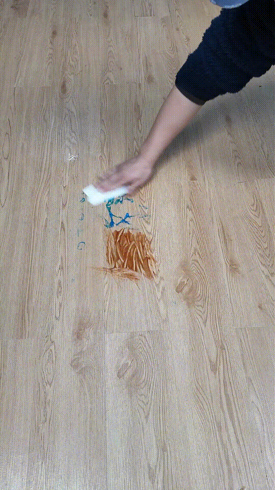 下图为静置2小时干涸结块的颜料,用手触摸都能感觉到硬度,实测JX往返一次就彻底擦掉了,地砖上没有残留的油膜,用手摸起来是干爽的,不是黏糊糊的,而且地面没有留下任何颜色印记,也没有拖布来回涂抹的痕迹,这比同价位很多机型擦完还得手动补擦强太多。