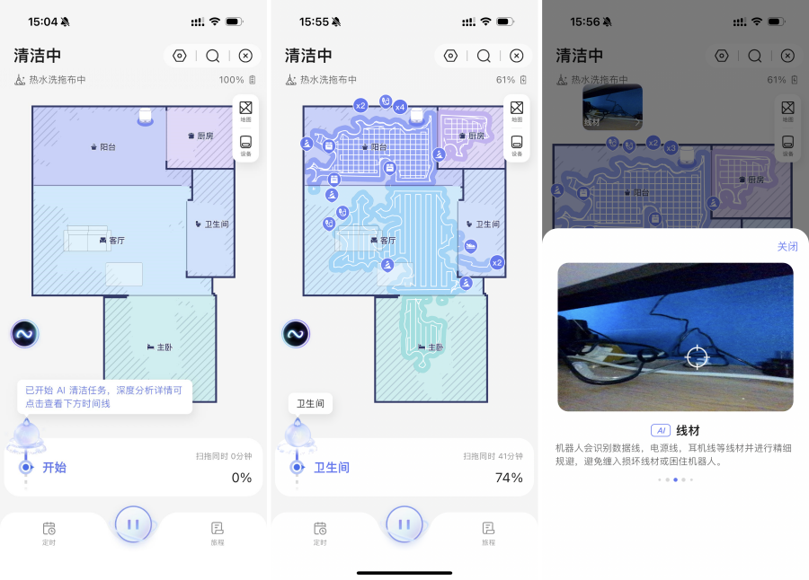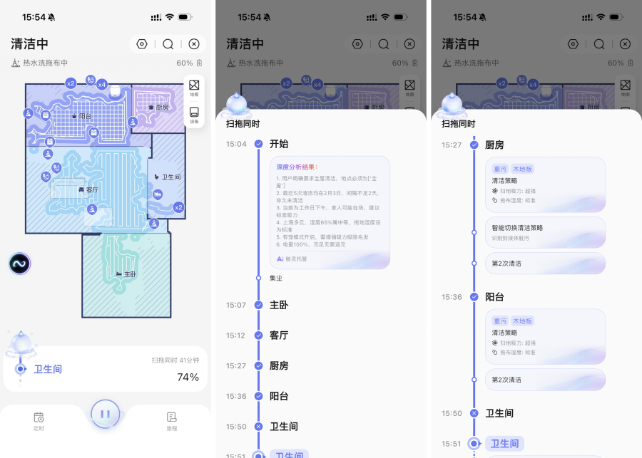 当然,以上均为专业场景下的搭建测试,核心目的是让大家直观看到云鲸JX在清洁能力上的上限。而日常使用中,这些“极端考验”的场景基本不会同时出现,所以我们评测室特别推荐,日常清扫直接用鲸灵托管AI系统就绰绰有余。当你打开这个一键清扫模式后,云鲸JX既能为你定制最适配的地面清扫方案,还能在APP上实时同步地面的清扫状态,妥妥的懒人清洁天花板,操作超省心。