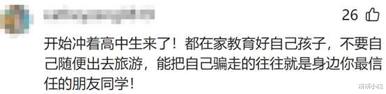 这位网友称,现在这帮人开始盯上高中生了!家里有娃的,千万别让孩子自己随便出去旅游!最容易把孩子骗走的,往往就是身边最信任的朋友、同学,防不胜防啊!