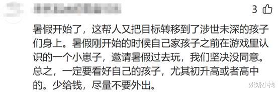 另一位网友觉得,暑假一到,这帮人又把主意打到孩子身上了!暑假刚开始那会儿,我家孩子在游戏里认识的一个小子,喊他暑假过去玩,我们直接给拒了。