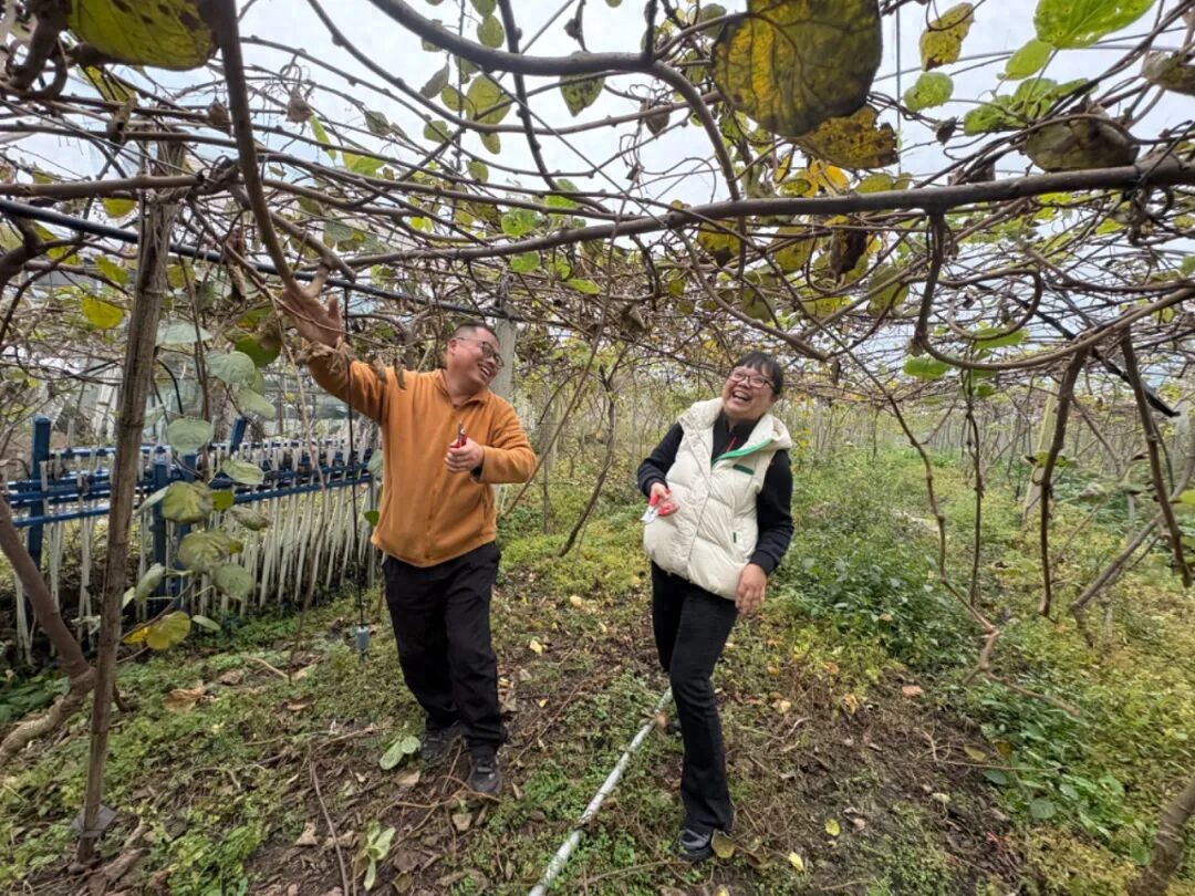 离开果园时,小雨暂歇。李治菲和邓方贵取来剪刀,一前一后走进猕猴桃园里剪枝,他抬手扶住枝条,她精准落下剪刀,动作间满是常年搭档的默契。