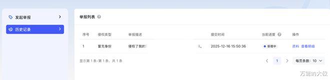 3、举报完成后,在“历史记录”里,就能查看“进度”,你还可以在明细里“撤销举报”,也可以在对方举证后,继续补充材料。