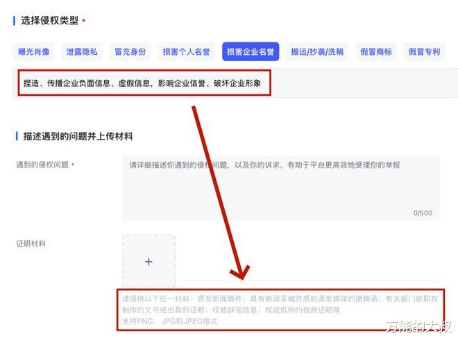 “捏造、传播企业负面信息、虚假信息,影响企业信誉、破坏企业形象”。在“证明材料”,平台要求你提供一下任意材料(画个重点):