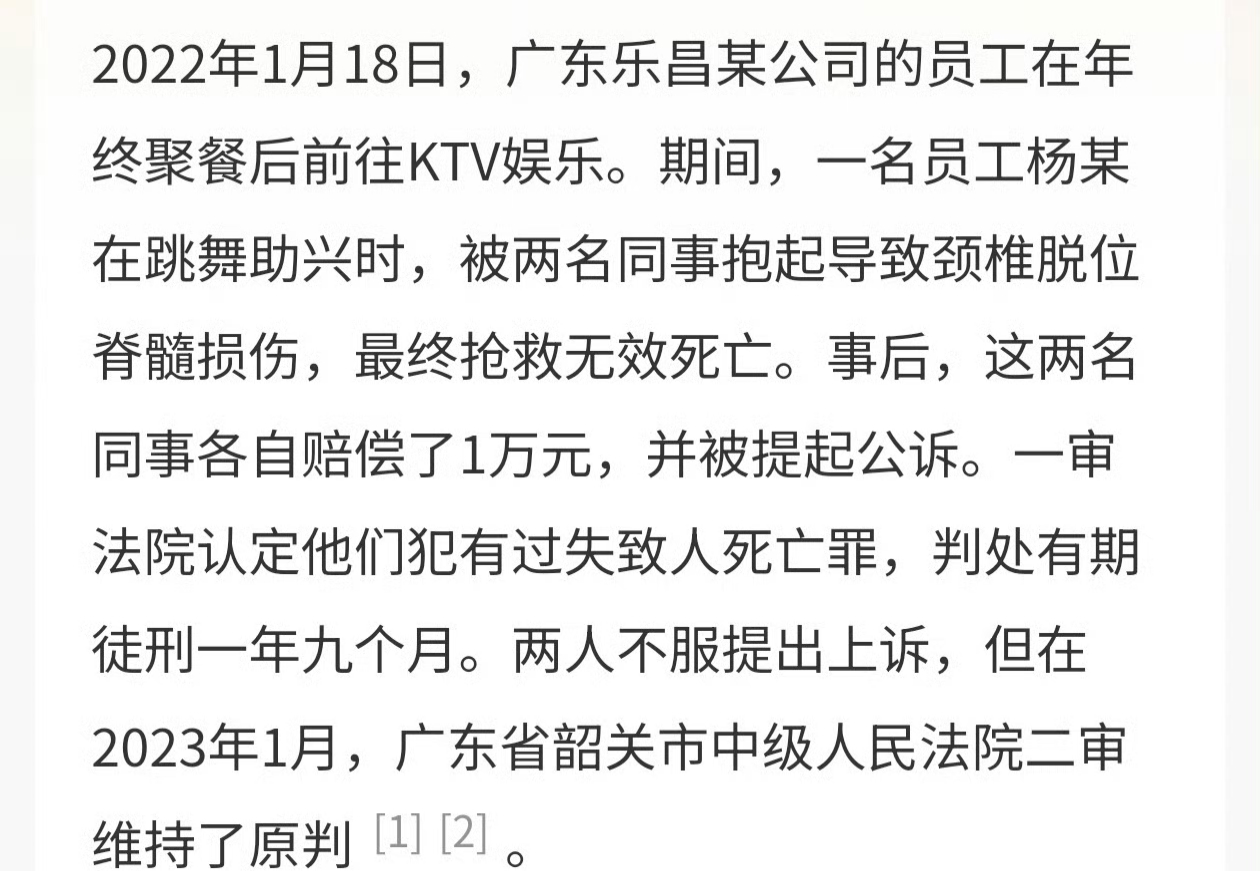 2022年1月18日,广东乐昌一家公司组织年终聚会,本是欢乐的时刻,却在KTV中发生了令人痛心的悲剧。员工杨某在唱歌过程中因兴奋开始跳舞,两名同事孙某和刘某出于玩笑心态突然将他抱起,然而几人没站稳,杨某头朝下重重地摔倒在地,导致颈椎脱位、脊髓损伤。尽管随后杨某被紧急送往医院,但最终还是未能挽回他的生命。