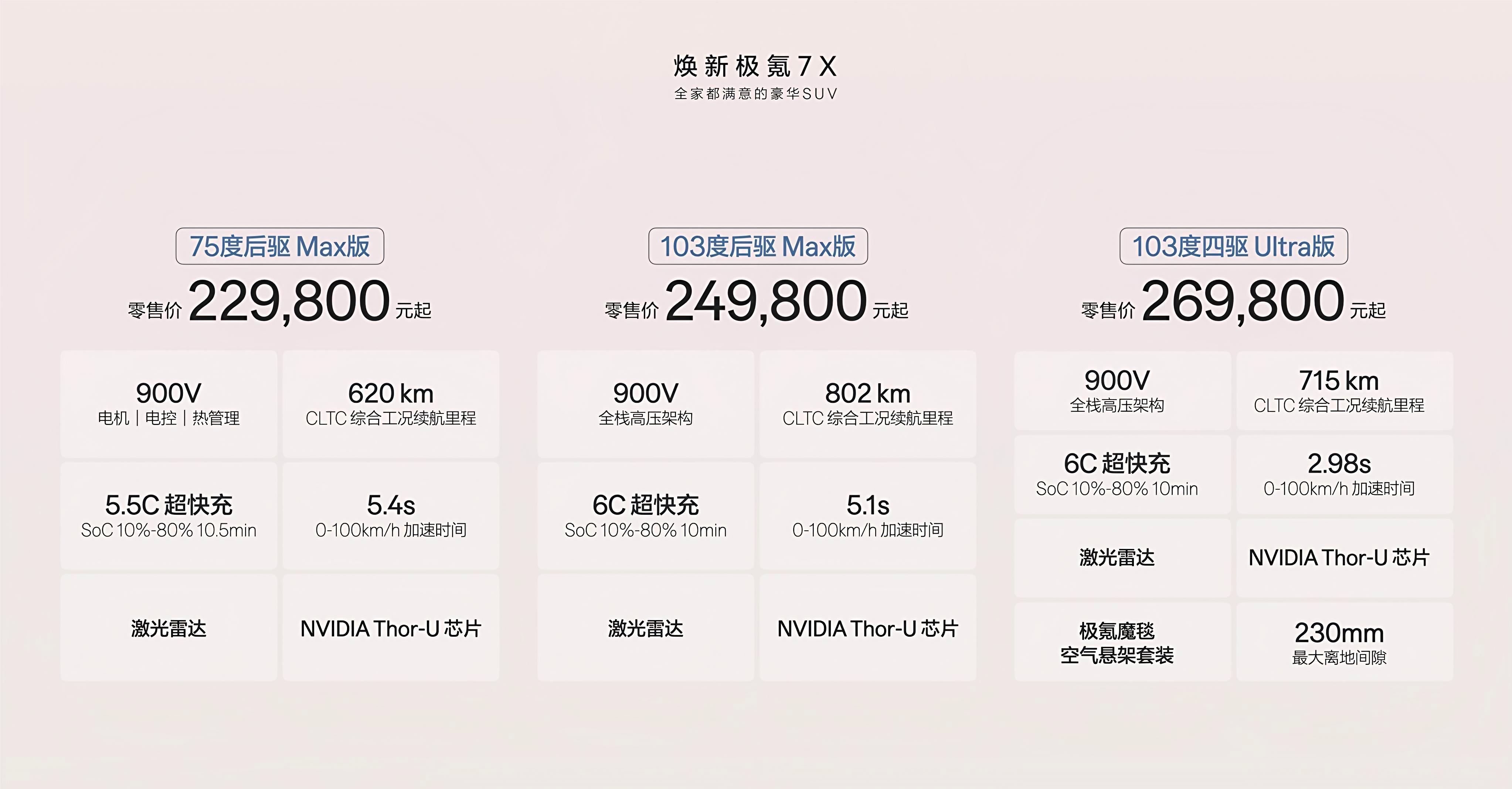 动力分两个版本:后驱单电机503马力,零百5.1秒;四驱双电机796马力,零百冲进3秒区间。日常通勤的话,后驱完全够用,起步轻快,超车不拖沓;四驱更适合对性能有执念,或者常在湿滑路面开车的人。