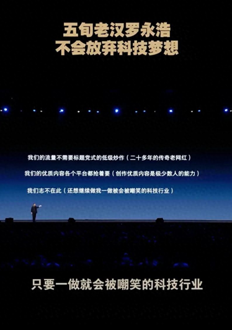 罗永浩表示“志不在此”,还想继续做他一做就会被嘲笑的科技行业,会一直做这个,无论是期待看到他在科技行业继续出丑和失败的“罗黑”,还是希望他五旬老汉没有放弃科技梦想的人都不会失望。