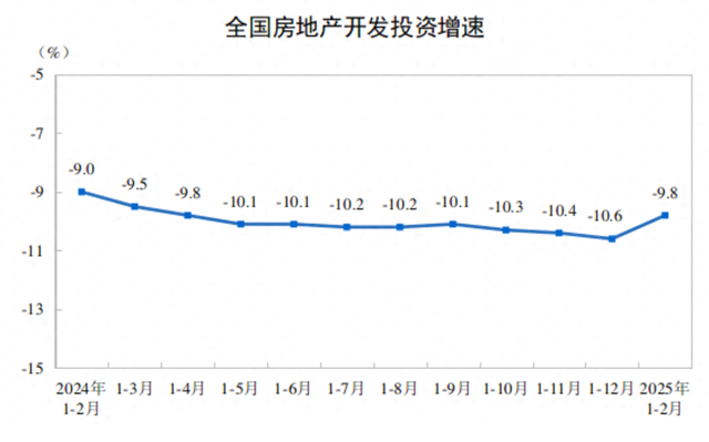 1—2月份,全国房地产开发投资10720亿元,同比下降9.8%(按可比口径计算,详见附注6),降幅比上年全年收窄0.8个百分点;其中住宅投资8056亿元,下降9.2%,降幅收窄1.3个百分点。