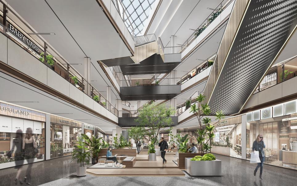 其中商业部分采用“四层生活魔方”设计——地上三层、地下一层,配合三个中庭区域,形成富有动感和艺术氛围的开放式空间,并配备巨幕拉索幕墙、3D互动大屏等设施。
