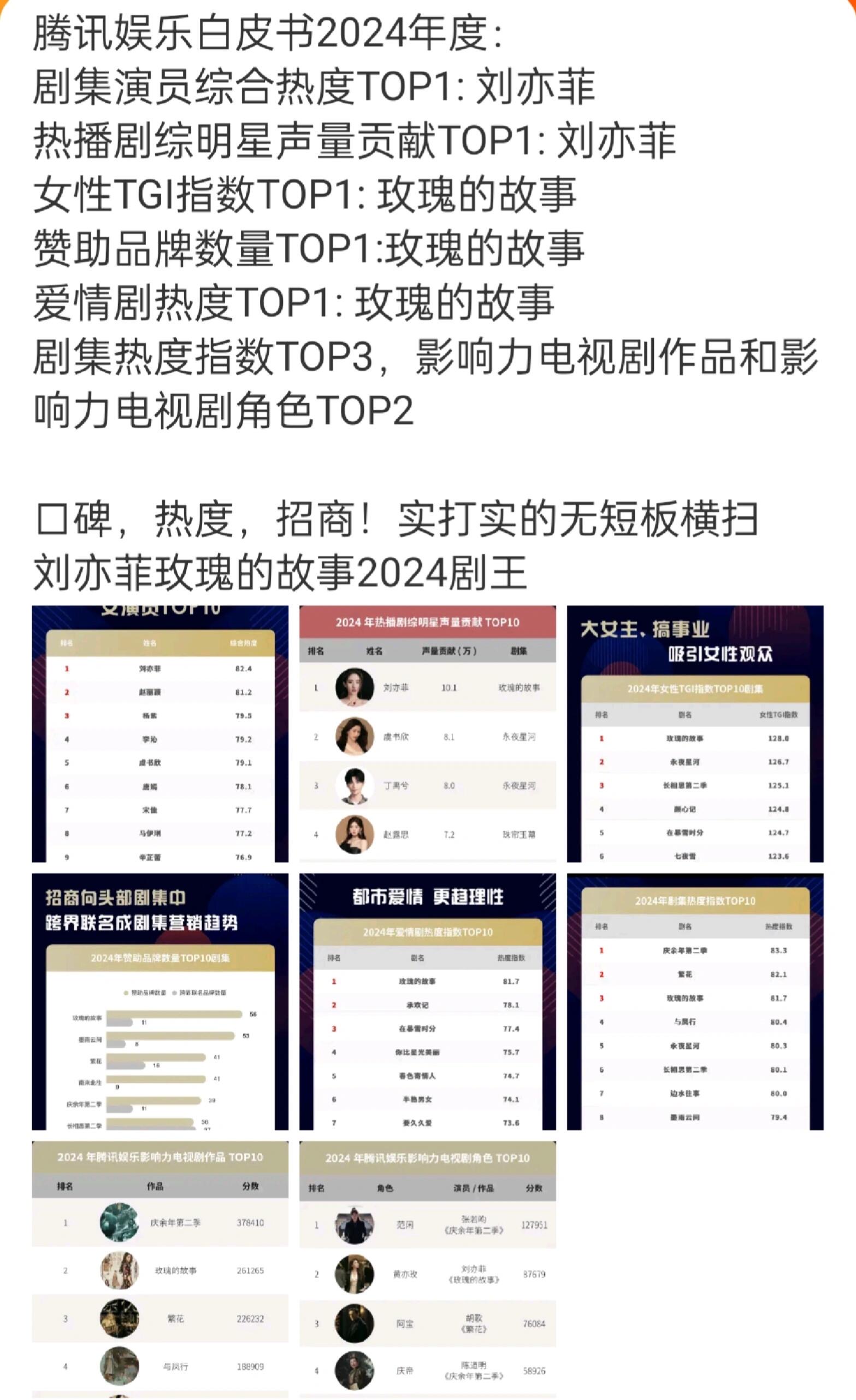 2024年的影视圈,刘亦菲凭借在《玫瑰的故事》中饰演的黄亦玫一角的杰出表现,她不仅征服了亿万观众的心,还将自身推向了前所未有的职业巅峰。该剧在腾讯视频上创造了骄人的成绩,会员增长惊人,招商排名遥遥领先。刘亦菲也因此荣登腾讯娱乐白皮书剧集女演员热度榜首,横扫多项权威榜单。