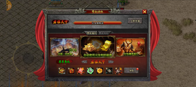 部分服会送“至尊VIP”,挂机收益翻倍,自动回收装备。