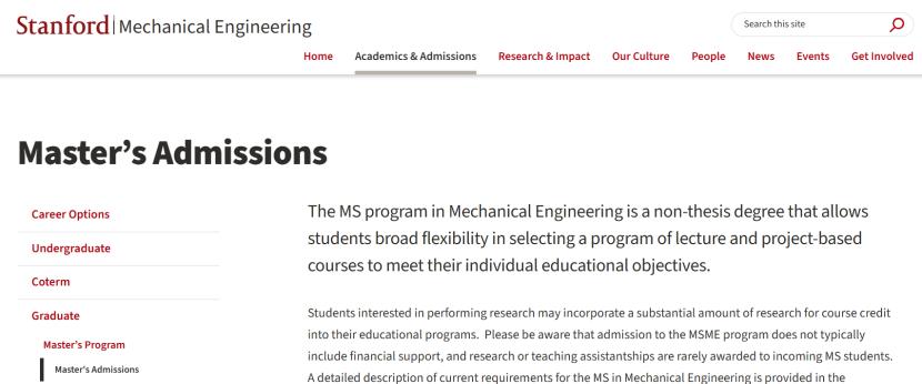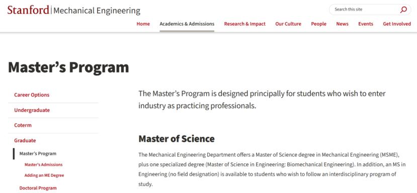 该系开设的机械工程硕士(MS in Mechanical Engineering)是一个非论文学位,其优势在于为学生提供广泛灵活性,允许学生通过选择讲座式与项目式课程组合来满足其个人教育目标。