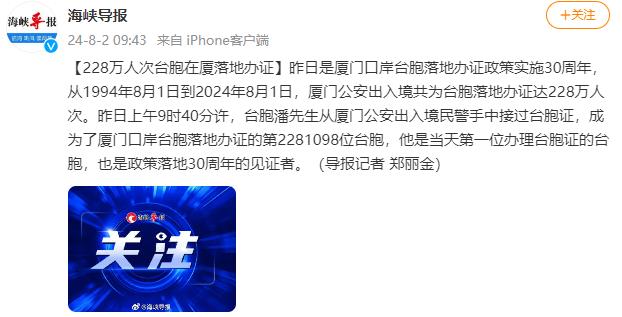 当然台湾的网红所发表的纪录片中提到的也仅仅是厦门一个城市,而早在2024年8月1日,厦门公安出入境为台胞落地办证的人数就已经达到了228万人。