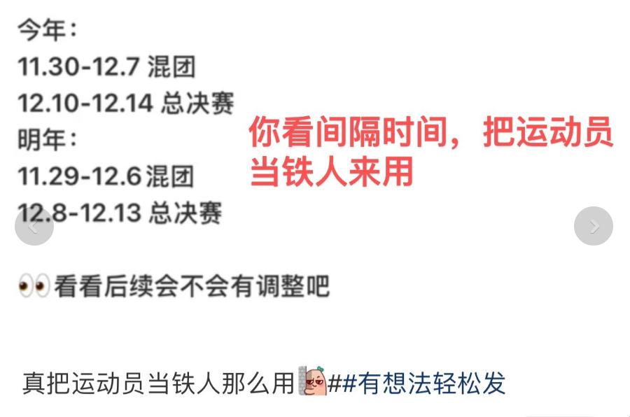 第三条。“明年的混团跟总决赛是不是也要隔开一些?让运动员多休息一下也好啊,这么密集的时间,就只隔一天,连适应球桌的时间都没有,不能把运动员当铁人来用。”