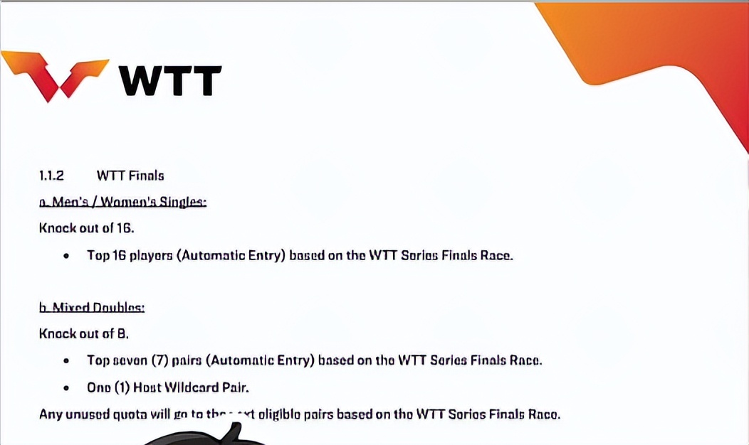 WTT总决赛混双改为8签淘汰赛,由原先的5天赛程,调整为6天。