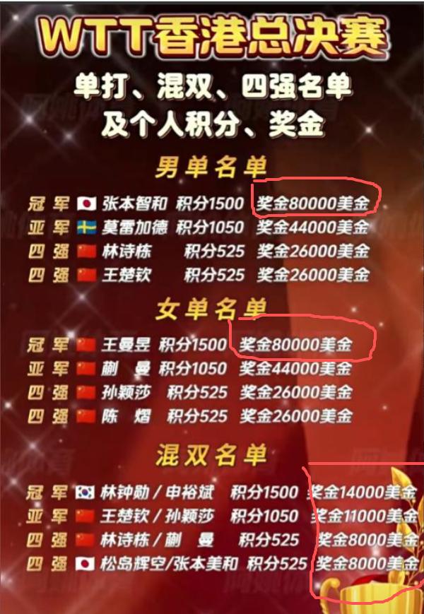 就例如2025年香港总决赛的奖金,单打冠军是8万美金,最终王曼昱还被追加了2.35万美金,而相对比混双呢?