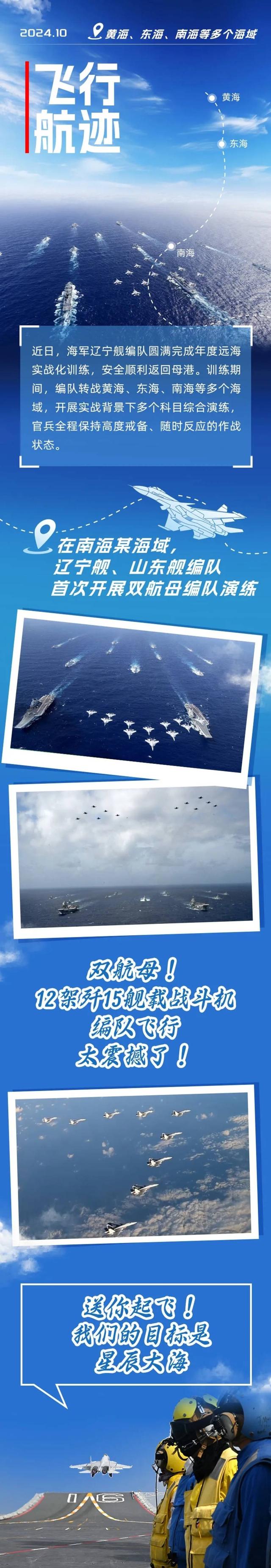 飞行航迹:双航母首次“同框”演练,12架歼15舰载战斗机编队飞行