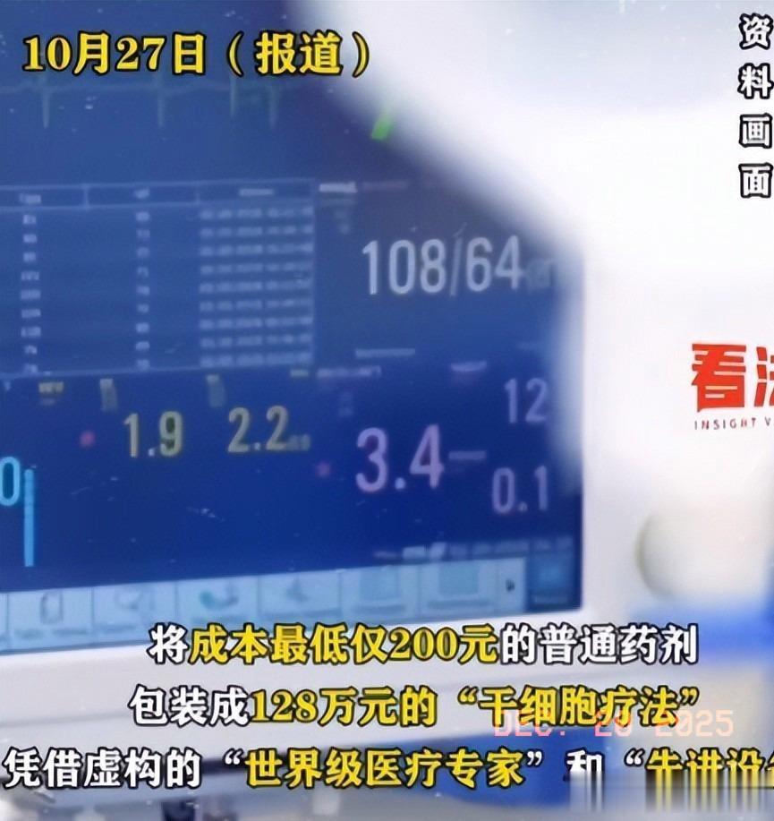 所谓“一对一报告解读”,成了“恐吓现场”。“专家”许某拿着伪造的体检单,指着“脑细胞萎缩”“肠道供血不足”的虚假结论说:“不做干细胞治疗,以后可能半身不遂!”一次治疗报价52万,还附赠“一年四次免费复诊+食宿全包”,陈女士一算“划算”,当场交钱。