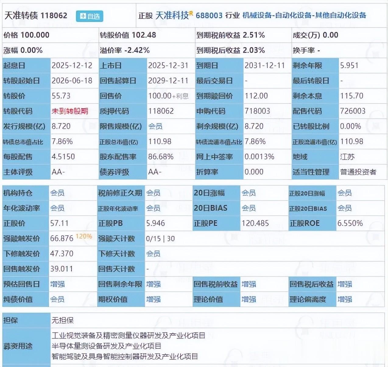 根据当前市场情绪及可转债交易行情,天准转债上市时预计会有35%的溢价,预估上市价值为138元。