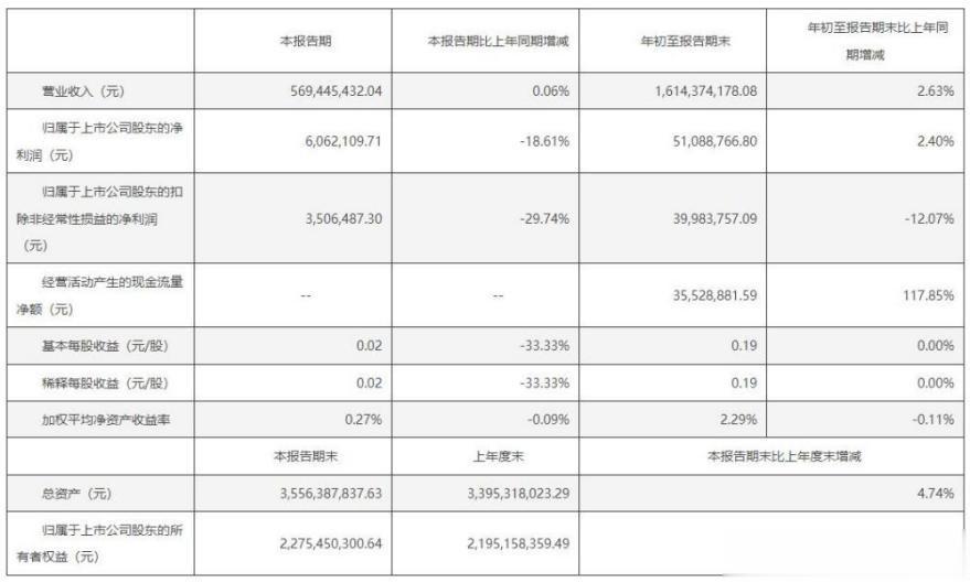 2025年前三季度公司实现营业收入1614374178.08元,同比增加2.63%;实现归属于母公司所有者的净利润为51088766.8元,同比增加2.4%;实现归属于母公司所有者的扣除非经常性损益的净利润为39983757.09元,同比减少12.07%。