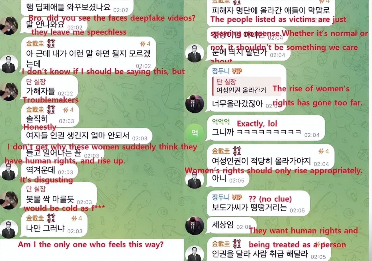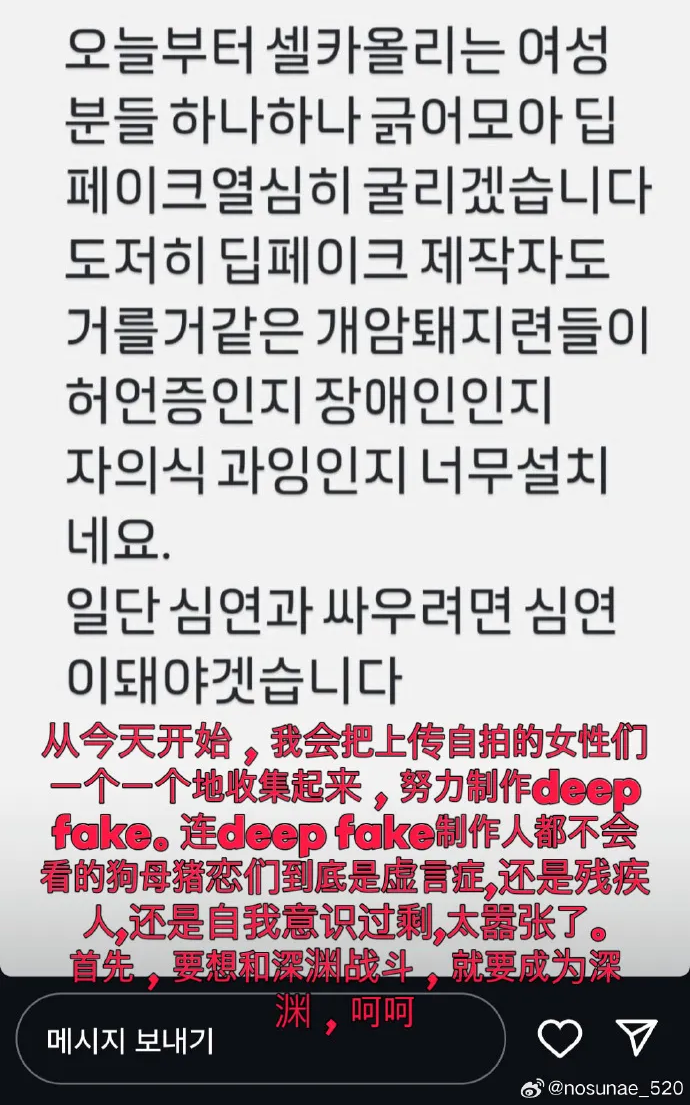 当韩女们无奈将自己上传到社交媒体的照片删掉时,韩男也会冲上来冷嘲热讽,甚至有初中男生开公开写到“不用担心,你不够漂亮,不至于被Deepfake”这种极端厌女的言语。