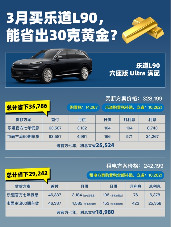 当95号汽油重返9元时代,家庭用户的用车账本正在被重新翻开。乐道在2026年3月推出的购车权益,是一套针对置换痛点的"组合拳":首付20%;7年超长周期金融方案年化费率仅0.49%,日供低至89元(含电池租金),折算月支出约2670元。这是什么概念?以当前油价计算,一辆中大型燃油SUV每月行驶1500公里的油费就要1350元,加上保养、保险、折旧,月用车成本轻松突破4000元。而乐道L90的日供不仅覆盖车款,还包含电池租赁——相当于"油费变月供",用车成本不升反降。