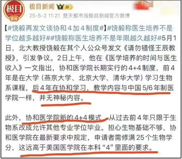 5月1日,他在公众号发文《请勿错怪王辰教授》,否认自己说过协和“乌烟瘴气”,并力挺推行“4+4”模式的王辰院士是“改革真英雄”。文章强调:“4+4体系本身没有问题,违规者应被批评,但不能否定整个模式”。