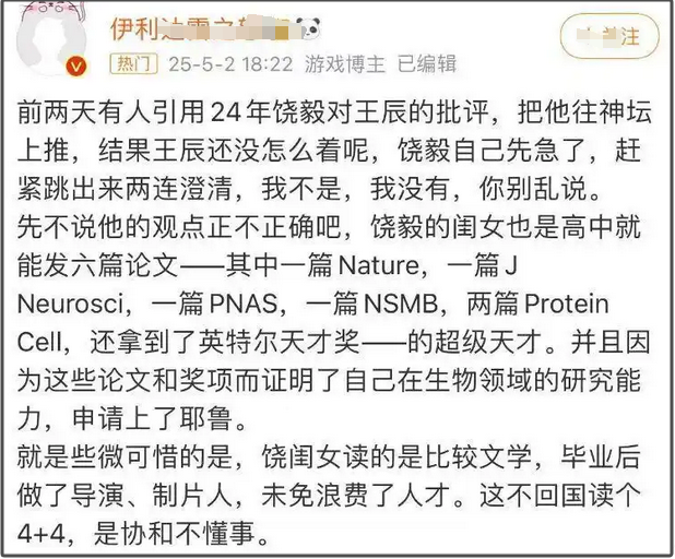 令人玩味的是,饶毅闺女大学却转攻文学评论,毕业后尝试演员未果改做制片人。若真凭那6篇论文的"实力",本可轻松杀回生物医学圈。或许正因其不愿"祸害人",她才选择另谋出路。